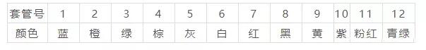 光纜線序色譜排列光纖色譜1# -12#:一般是藍(lán)、桔、綠、棕、灰、白、紅、黑、黃、紫、粉紅、青綠。