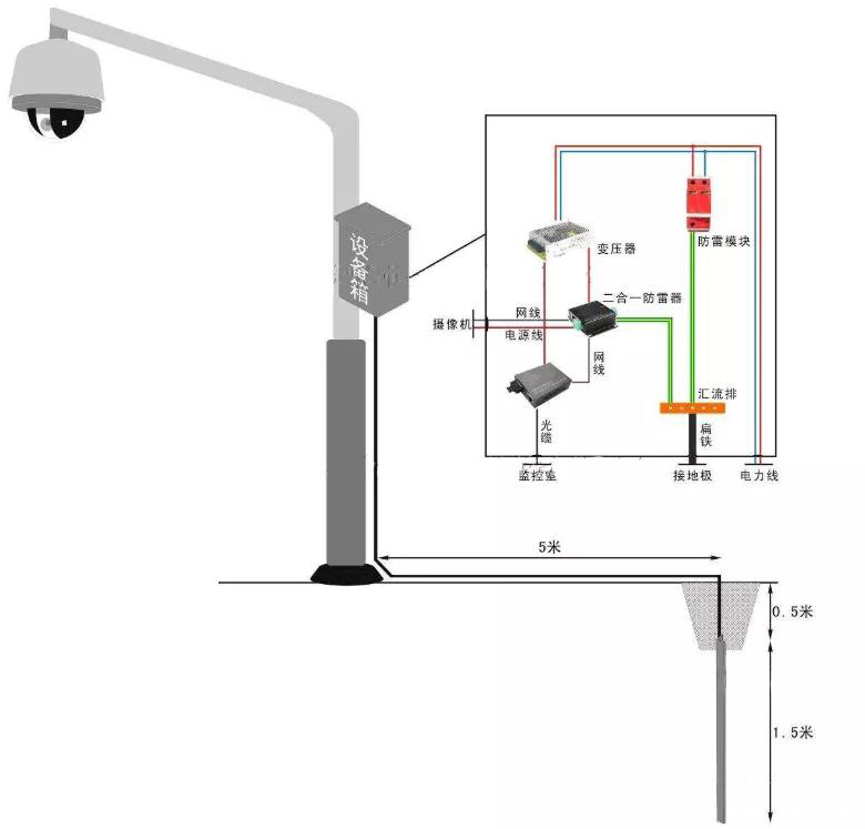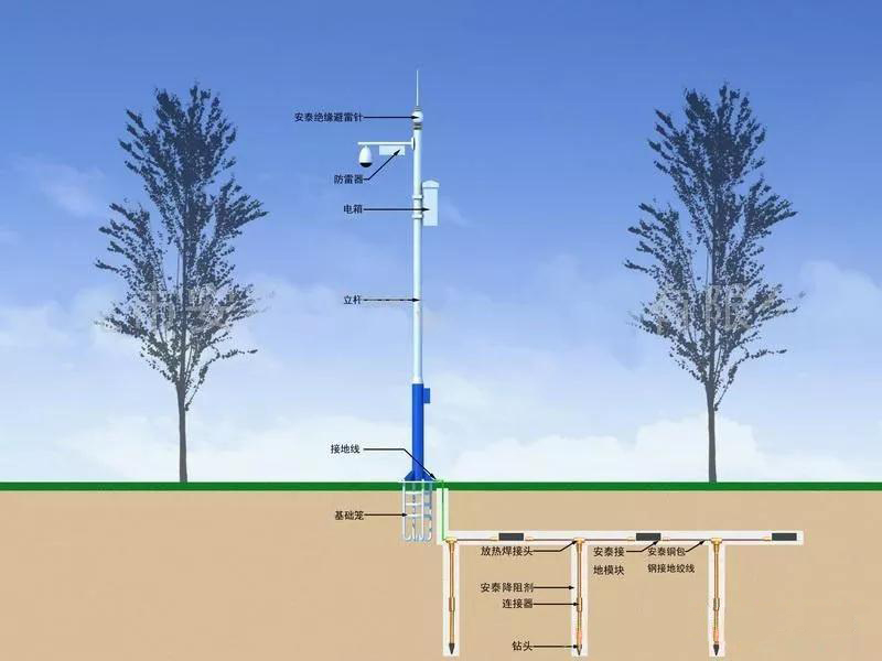 1、前端設(shè)備如攝像頭應(yīng)置于接閃器(避雷針或其它接閃導(dǎo)體)有效保護(hù)范圍之內(nèi)。當(dāng)攝像機(jī)獨立架設(shè)時,避雷針最好距攝像機(jī) 3-4 米的距離。如有困難避雷針也可以架設(shè)在攝像機(jī)的支撐桿上,引下線可直接利用金屬桿本身或選用Φ8 的鍍鋅圓鋼。為防止電磁感應(yīng),沿桿引上攝像機(jī)的電源線和信號線應(yīng)穿金屬管屏蔽。