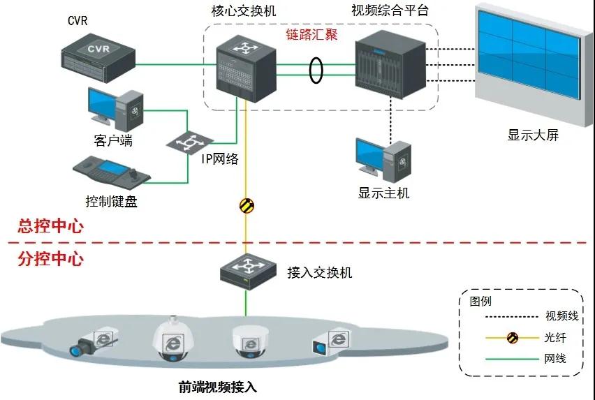 總控中心:負(fù)責(zé)對分控中心分散區(qū)域高清監(jiān)控點(diǎn)的接入、顯示、存儲、設(shè)置等;主要部署核心交換機(jī)、視頻綜合平臺、大屏、云存儲、客戶端、平臺、視頻質(zhì)量診斷服務(wù)器等。